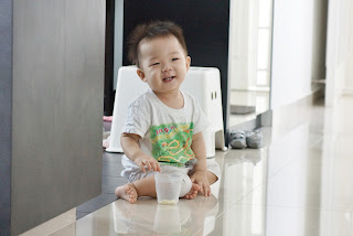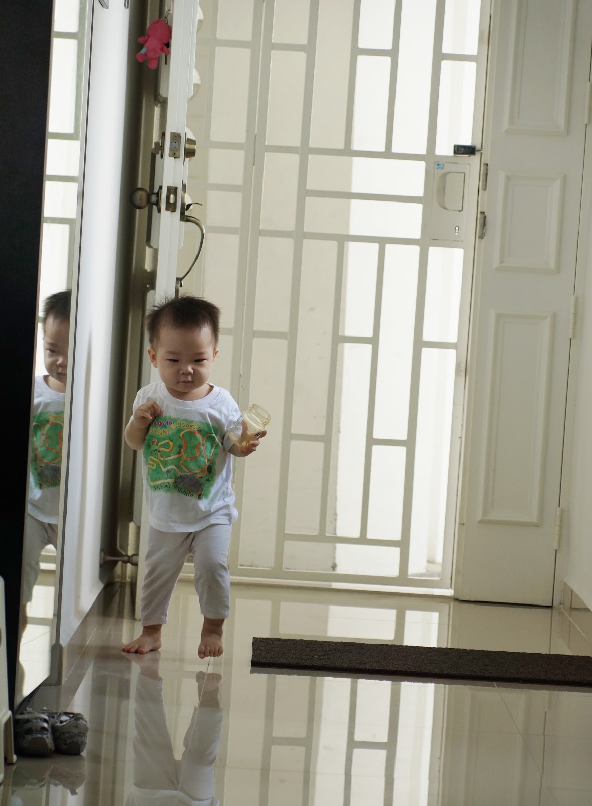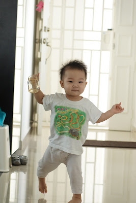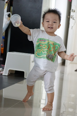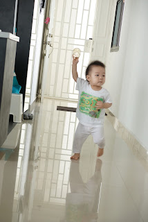 After probably few more days later i wouldn't have another chance to take cute pictures or videos of him walking wobbly, hands swaying in the air like a drunkard. He is improving by leaps daily. =)