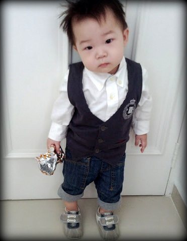 Well, Kieran was very shy in front of the judges, as usual he always do when facing strangers. (so i didn't expect him to win any title.) He need time to warm up. When asked to stand on his own and to do a mini catwalk, he clings to me very tightly as though those judges are going to carry him away from me. Haha. and when questions was being asked, he just constantly shook his head refusing to answer or response them, and even refused to smile for the camera!