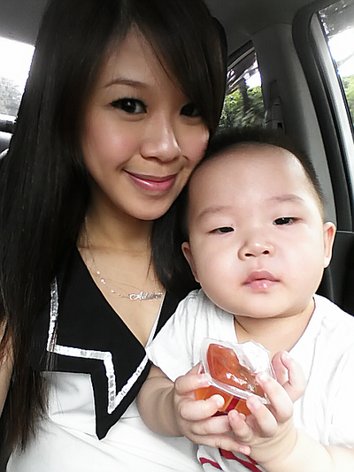 Daddy brought us out for movie and lunch on Mother's day! on our way to Golde village at Yishun. munching away in the car as usual.