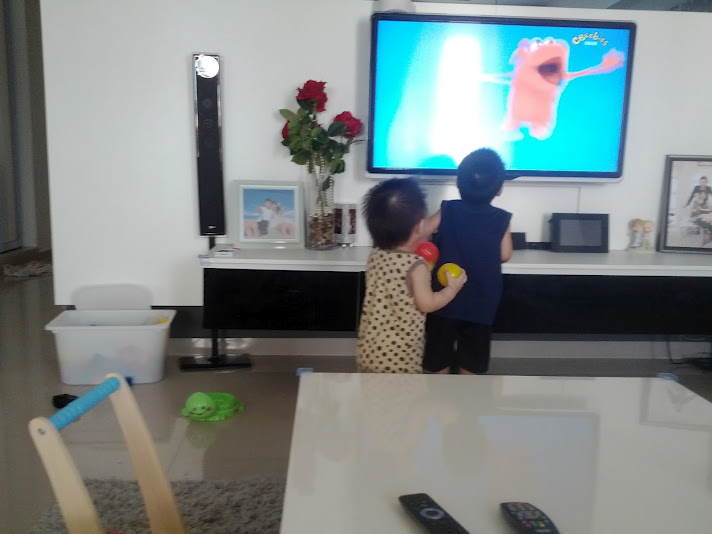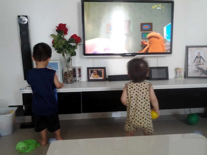 Aden and Kieran watching cbeebies, I wondered why kids just love to stand close to the televsion!